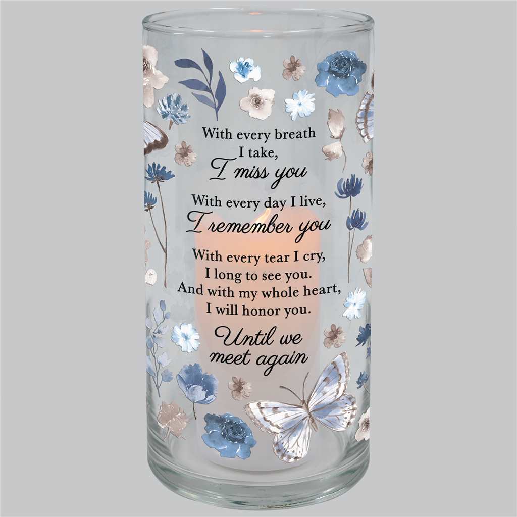 Glass with flickering LED flame candle (4x2" dia). Built-in automatic timer 6 hours ON/18 hours OFF. CR2032 battery included. Colour print can be seen from inside of the glass. Handwash recommended.