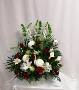 For the sweet spirits who touch our lives, a classic pairing of red and white that is both vibrant and respectful. Beautifully contained in a white basket.