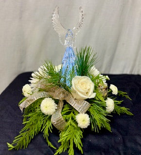 A graceful Christmas angel rises from a lush arrangement of fresh-cut seasonal flowers, creating a warm and elegant holiday display. Perfect as a festive centerpiece, it brings beauty, serenity, and classic Christmas charm to any space.