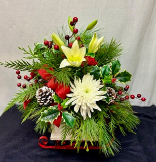 This charming Christmas flower arrangement in a sleigh dish brings festive joy with its vibrant blooms. The sleigh, a symbol of holiday cheer, cradles the flowers, filling the air with seasonal warmth and beauty. Perfect for adding a touch of Christmas spirit to any space.